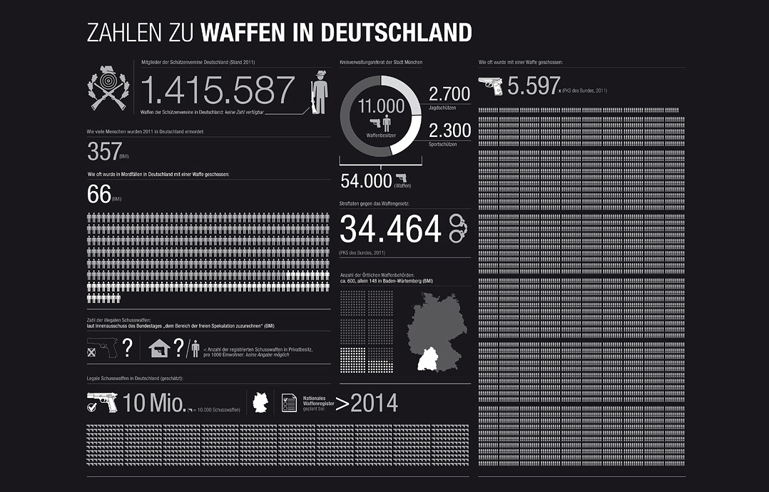 Infographic for Süddeutsche Zeitung on the topic of firearms distributed in germany. Note: the font was switched to their corporate typeface during the layout process. All set up in k-percentages to match ISOnewspaper26v4-demands.